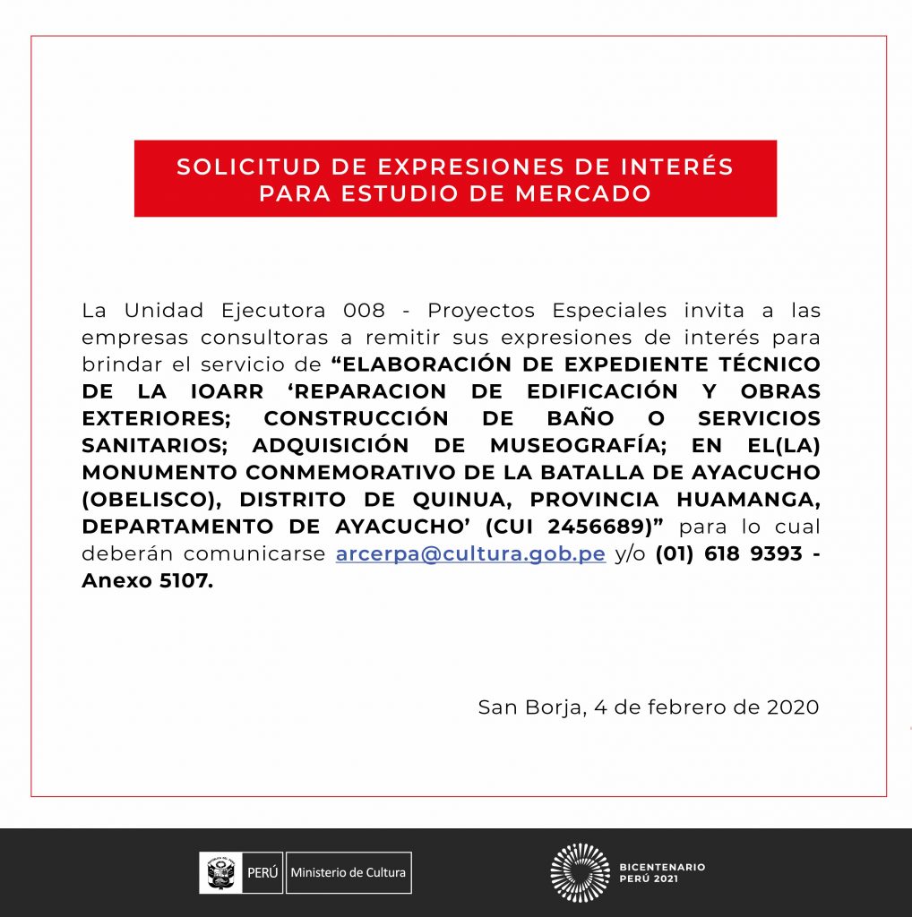 La Unidad Ejecutora 008 – Proyectos Especiales invita a las empresas consultoras a remitir sus expresiones de interés para brindar el servicio de “ELABORACIÓN DE EXPEDIENTE TÉCNICO DE LA IOARR ‘REPARACION DE EDIFICACIÓN Y OBRAS EXTERIORES; CONSTRUCCIÓN DE BAÑO O SERVICIOS SANITARIOS; ADQUISICIÓN DE MUSEOGRAFÍA; EN EL(LA) MONUMENTO CONMEMORATIVO DE LA BATALLA DE AYACUCHO (OBELISCO), DISTRITO DE QUINUA, PROVINCIA HUAMANGA, DEPARTAMENTO DE AYACUCHO’ (CUI 2456689)” para lo cual deberán comunicarse a rcerpa@cultura.gob.pe y/o (01) 618 9393 – Anexo 5107.